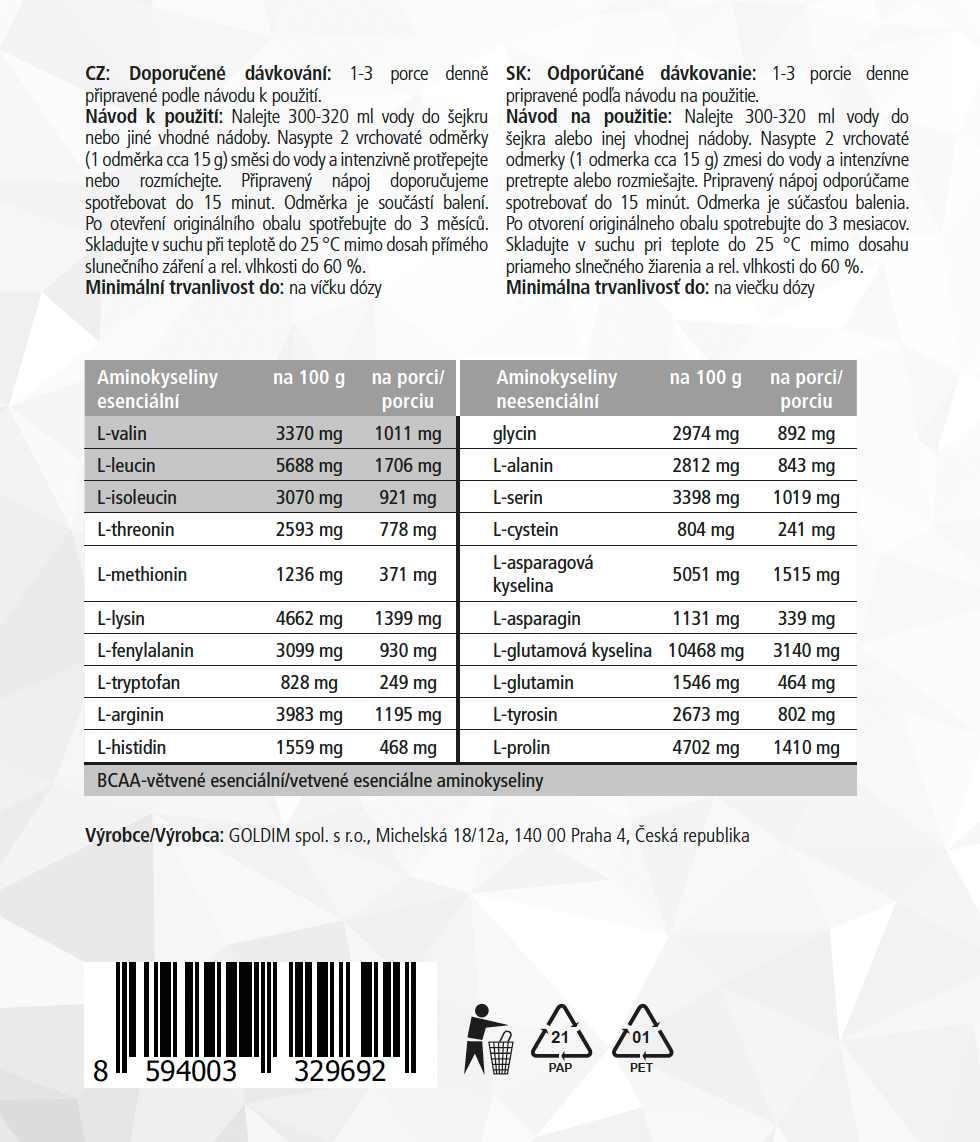 Komplex proteinů zajišťuje dlouhodobou výživu svalů i díky větveným aminokyselinám BCAA – podrobný aminokyselinový profil ZDE.