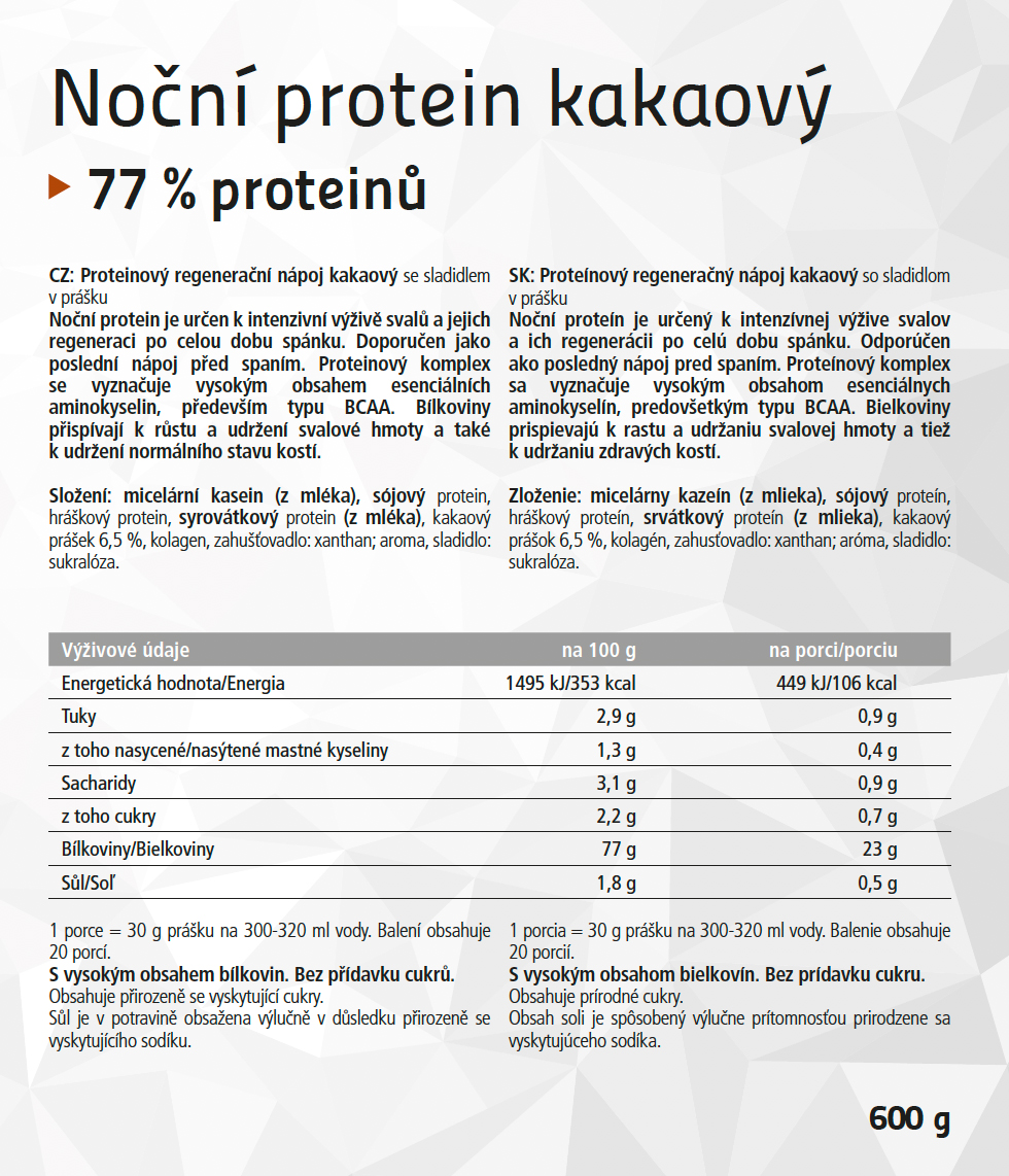 - Noční protein je určen k intenzivní výživě svalů a jejich regeneraci po celou dobu spánku.